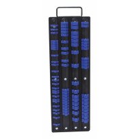 Organizador profesional para tapas de 1/4", 3/8" y 1/2", con capacidad para hasta 80 piezas. Incluye rieles metálicos y clips resistentes con sistema de retención por bola, ideal para mantener el taller ordenado y trabajar con mayor rapidez.