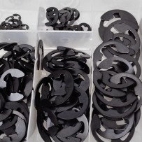 300 Kit de Clipe de Segurança E-Clip, 1,5 a 22 mm. Fabricado em aço fosfático com acabamento preto, organizado em caixa de plástico.
