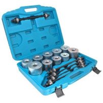 Extractor Universal projetado para a maioria dos carros e microônibus, ideal para montagem e desmontar buchas, rolamentos e selos de forma rápida e segura. Inclui um conjunto completo de 22 bushes e 5 fusos roscados para ajustar várias aplicações no workshop.