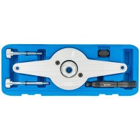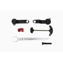 El set incluye, entre otros: montaje de la rueda dentada del árbol de levas, bloqueo del tensor, pasadores para quitar/instalar los árboles de levas de la culata, casquillos de sincronización de válvulas, bloqueo de la cubierta de la correa del tensor.